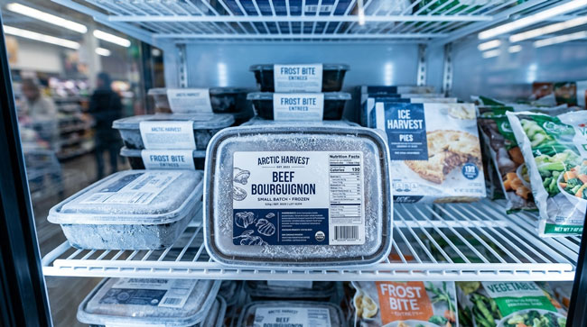 Frozen meals, ice cream, frozen meats and seafood, frozen fruits and vegetables, ice packs, frozen pet food, and any product that will be stored or displayed in a freezer case.